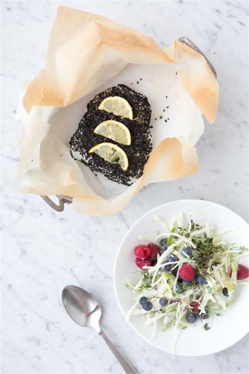 Læg fisken på et stykke bagepapir i et ildfast fad. Drys med nigellafrø, estragon, salt og peber. Dæk fisken med citronskiver. Pak den i bagepapir og bag den i ovnen ved 200 grader i 20-25 minutter.